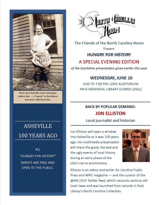 Jon Elliston opened his “Asheville in 1915” talk by appearing in period costume dressed as a “newsie” with a newspaper delivery bag slung over his shoulder, and walked up the aisle hollering out the news headlines of the day while passing out copies of a 1915 Asheville Citizen front page. All one hundred and fifty enthralled attendees were suddenly transported to
